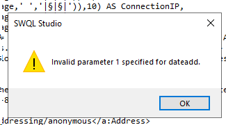 Query 3: Trying to get the last 7 days records with the parsed values, here am getting 'Invalid parameter 1 specified for dateadd', which is working fine in Query 2.