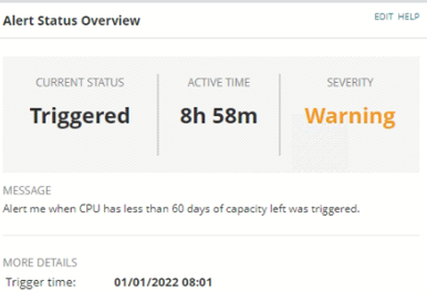 Normally the "x days left" alerts refer to capacity limits. I haven't seen this one myself, but might infer that the CPU utilization has been consistently trending upward and NPM expects it to hit 100% if either (A) more CPUs are not added or (B) if the process causing high CPU usage is not remediated.