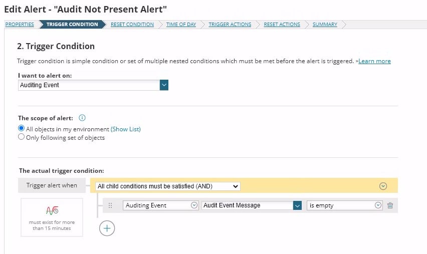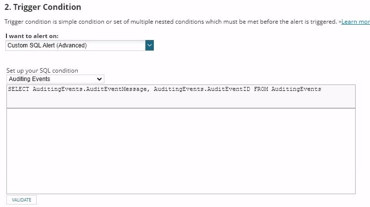 I have set the trigger condition as below & modified the sql condition for email as below so that I'll receive alert if audit is not present for last 30 min's (including evaluation time as 15 min)