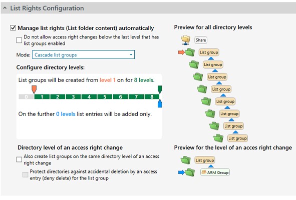 ARM does not create list groups for these levels. Access groups are provisioned by entering list rights directly into the Access Control List (ACL). This way overall less groups are created and Kerberos token size is minimized. On the other hand more ACL entries are required which may cause file server performance issues."