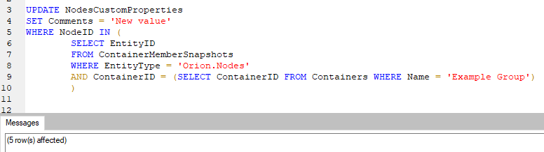 UPDATE NodesCustomPropertiesSET Custom_Property_Name = 'New_Value'WHERE NodeID IN ( SELECT EntityID FROM ContainerMemberSnapshots WHERE EntityType = 'Orion.Nodes' AND ContainerID = (SELECT ContainerID FROM Containers WHERE Name = 'Group_Name') )