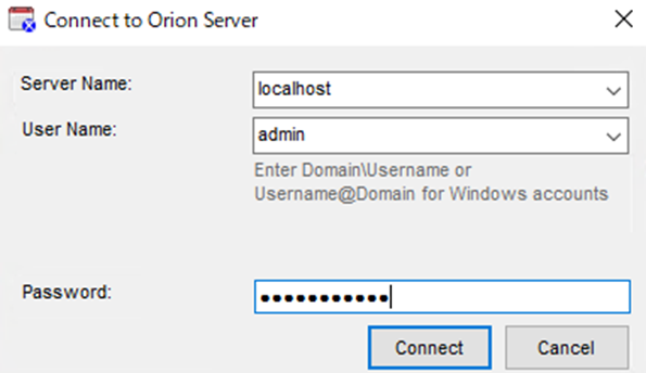 3. Orion Webコンソールのログインする時と同じ管理者アカウントのユーザ名/パスワードで[Connect]