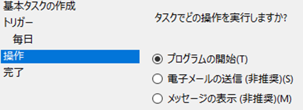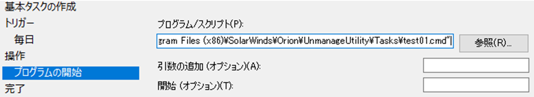 15. 操作では、プログラムの開始を選択し、上の10.でコピーされた.cmdパスをそのまま貼り付ける