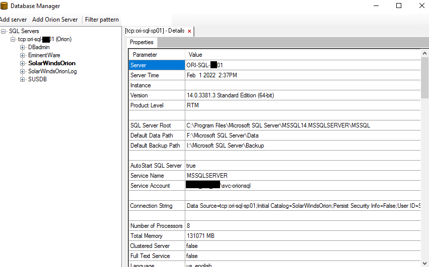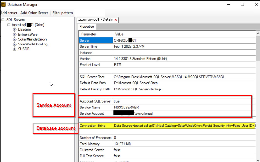 But I can see that if I go into Database Manager I can see if there - svc-orionsql. How can I change that