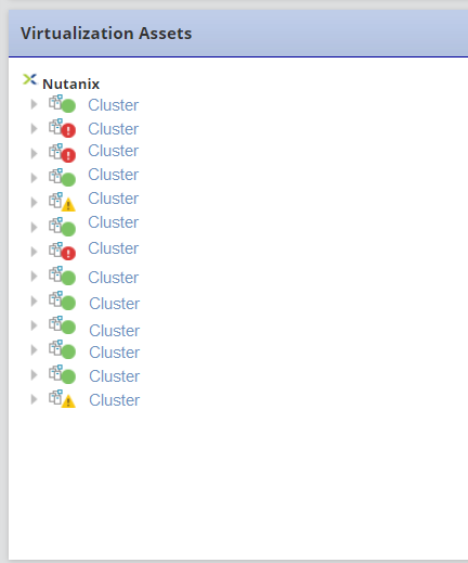 We set up Nutanix monitoring (Basic, not VMAN) and it is pulling a good amount of information that we want. However, I look at a cluster and it shows it as "Yellow", when I click on that cluster, everything on the details screen is within bounds, nothing seems wrong. When looking at what Solarwinds is showing as warning, it just shows "Cluster <NAME>". When I click on that, it returns me back to the same cluster detail screen that I am on.