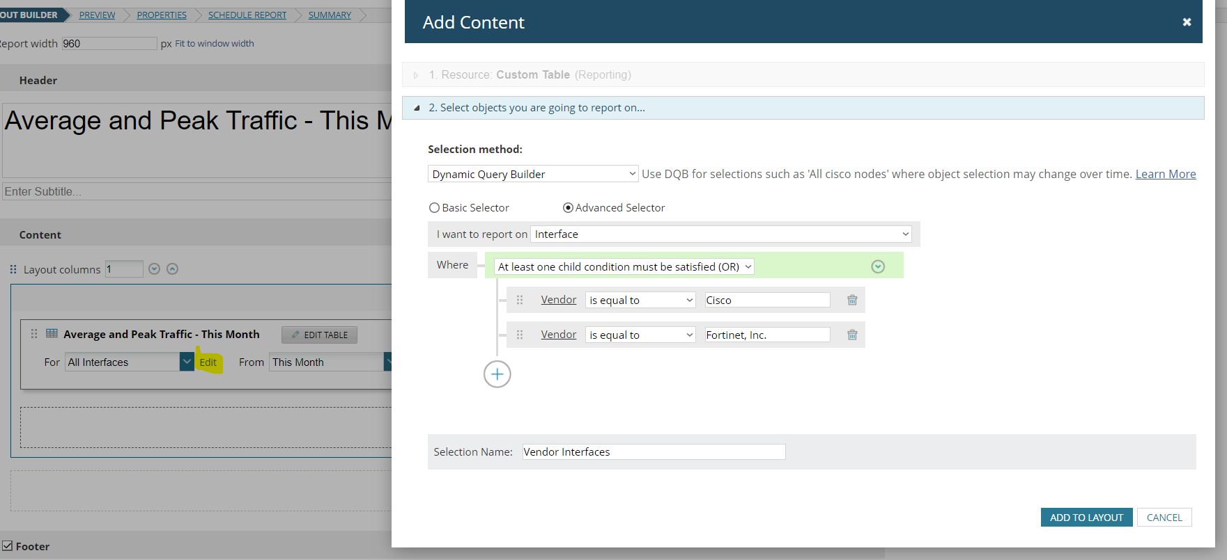 Hello I'm having some trouble creating a report. I have different vendors devices and I'm needing to do a weekly report that shows the a specific vendor, the interfaces on the devices, and the peak traffic on each interface. Im not well versed in sql, and the report wizard is not cutting it. I can do a peak report but it does all interfaces for every single device, but like I said im only wanting from a specific vendor. Any help would be welcomed. Thank you in advance.