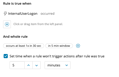 When creating a new rule I am trying to make sure it does not repeatedly alert my email, and I was trying to use the built in "Set time when a rule won't trigger actions after rule was true" setting in the rule definition, but it is not working. I added a screenshot below of a rule I tried to use to test if it would repeatedly send within 5 minutes. It kept on firing the rule and ignoring the "wont trigger" time limit. What am I doing wrong?