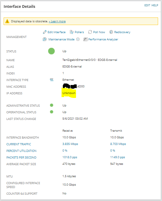 We have a few routers with HSRP configurations and we recently noticed that their IP address shows as Unknown in the interface details table on the page for interface. When looking at the polling details and the OID from snmpwalk, we see that there are 2 IPs with the same integer (see below). I've opened a ticket with support and they've told me that I need to "change the IP address to interface mapping which can be done on your network so that the Orion can detect it correctly." I'm not sure where this setting is in Solarwinds or on the routers, and I was hoping that someone on here may know. Or, if you've encountered this issue before, and you know how to address it, please share the solution.