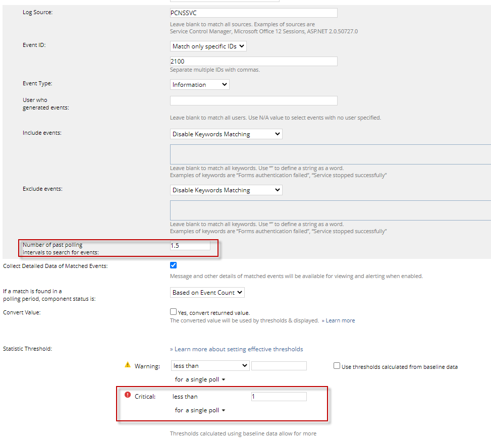 Within the component configuration for Windows event log monitoring, I specify the event and other proper information. See screenshot. My template polling frequency is 300 seconds, which is 5 minutes. I've messed with the "Number of past polling intervals" and changed it to 144, which equals 12 hours based on my polling interval of 5 min. I've also changed the Statistics Threshold to "less than 1" because I want to know if event 2100 is not detected. From the component monitoring screen, Event ID 2100 is detected, so I know that works. However, it doesn't seem to change the status to down or critical when it is not detected. It seems to change it to red because 2100 IS detected even though my settings say to change status when it goes below a count of 1.