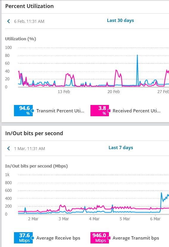 I saw a similar issue raised several years ago. We're running 2020.2. Percent Utilization has Transmit as blue, Received traffic as pink, whereas In/Out bits per second has Receive as blue, and has Transmit as pink.