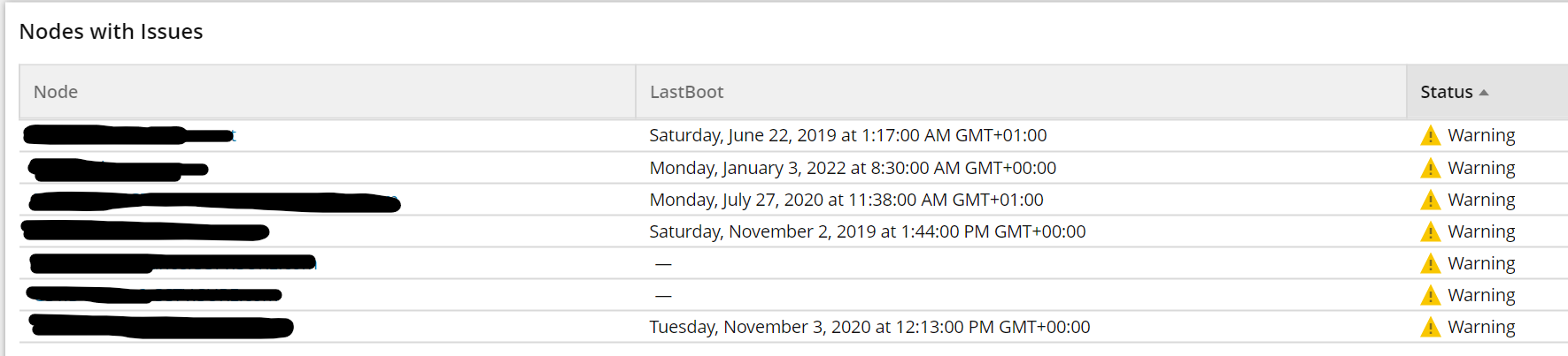 SELECT n.Caption,n.LastBoot,n.Status,n.DetailsUrl FROM Orion.Nodes n WHERE (Status = 2 OR Status = 3 OR Status = 14) AND InstanceSiteId IN(1, 2)
