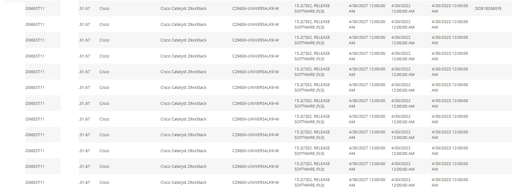 SELECT [Nodes].NodeCaption , [Nodes].AgentIP , [Nodes].Vendor , [Nodes].MachineType , [Nodes].OSImage , [Nodes].OSVersion , [Nodes].EndOfSupport , [Nodes].EndOfSales , [Nodes].EndOfSoftware , [Device].SerialFROM Cirrus.Nodes AS [Nodes]LEFT JOIN Cirrus.EntityPhysical AS [Device] ON [Nodes].NodeID = [Device].NodeID