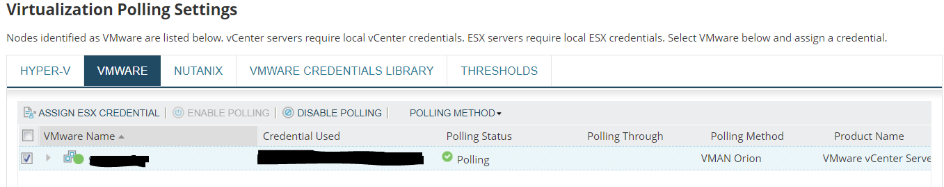 Yes it passes the credential test. It was working before deletion. After re-addition the Vcenter displays Machine type as Unknown. The polling method is set to ICMP and not able to modify to vman orion, if that adds to helpful inputs.