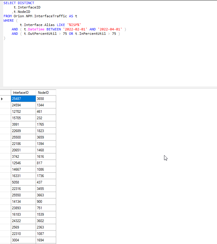 WHERE Alias LIKE '%ISP%' AND ( Interfaces.Traffic.DateTime BETWEEN '2022-03-01' AND '2022-04-01' )
