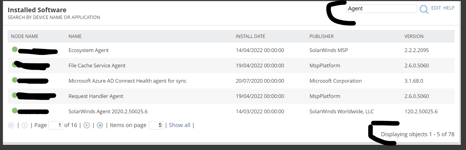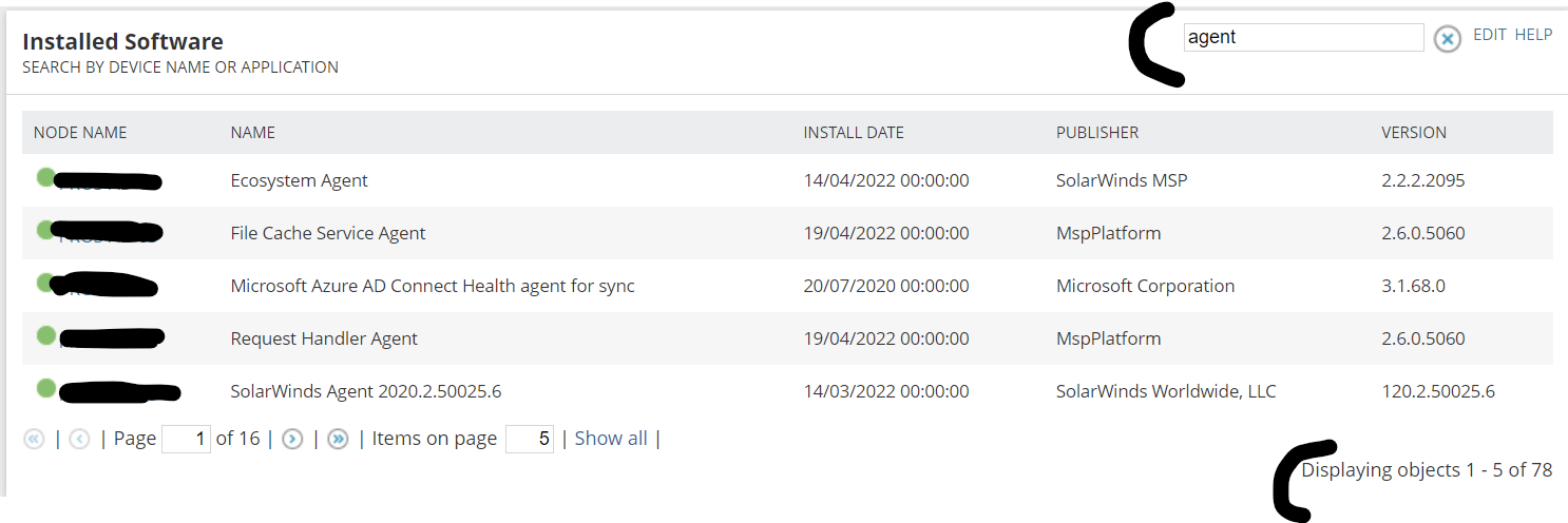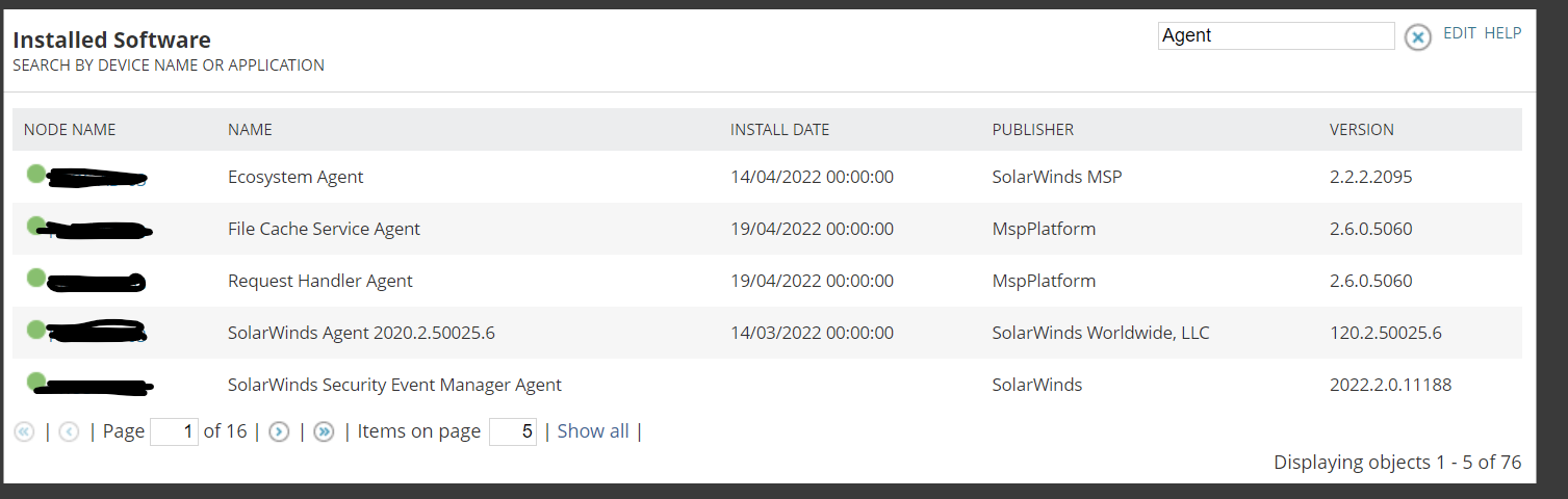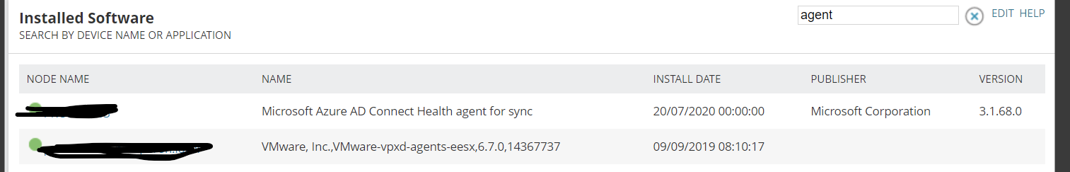 SELECTs.Polling.Node.Caption as [Node Name],'/Orion/images/StatusIcons/small-' + ToString(s.Polling.Node.StatusIcon) AS [_IconFor_Node Name], s.Polling.Node.DetailsUrl AS [_LinkFor_Node Name],s.Name, s.InstallDate as [Install Date], s.Publisher, s.VersionFROM Orion.AssetInventory.Software sWHERE s.Polling.Node.Caption LIKE '%${SEARCH_STRING}%' OR s.Name LIKE '%${SEARCH_STRING}%'