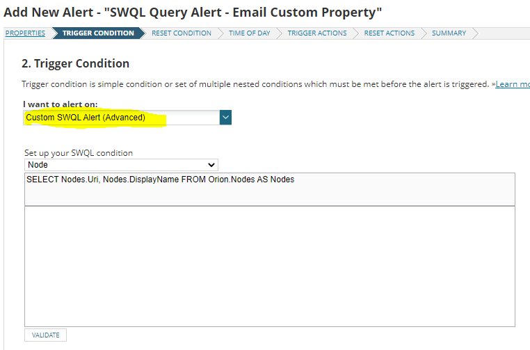 "SELECT Nodes.Uri, Nodes.DisplayName FROM Orion.Nodes AS Nodes --this is already filled in on the top of the alert"