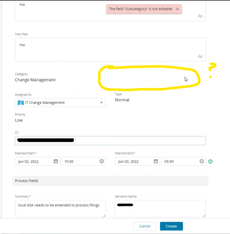 In the agent view, the Subcategory is missing from the ticket for him, and on Submit this error pops up after clicking Create: