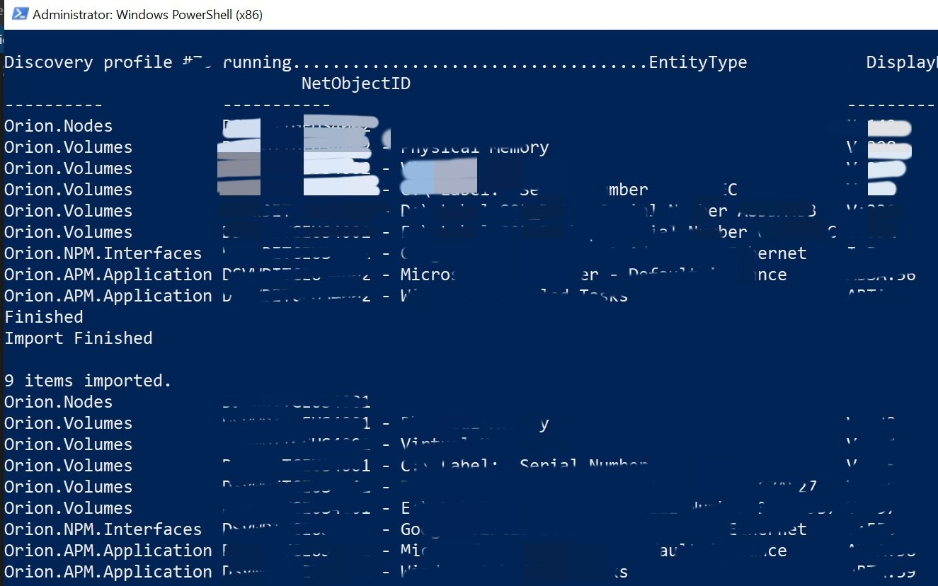 I was working on a powershell script to automate the discovery using script at "">github.com/.../DiscoverWmiNode.ps1". I was getting this output in screenshot. Is there is a way to exclude the import of Entity type Orion.APM.Application by making some changes in this script. Alternatively, Is there a way to turn off Orion.APM.Application import after running this script?