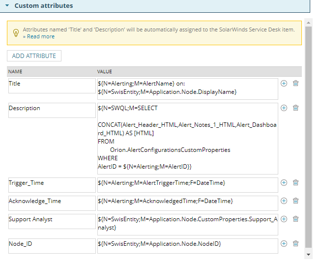 Is there a complete list of the Attributes / Custom attributes that are available to pass information in from the Orion "Create SolarWinds Service Desk Incident" alert action