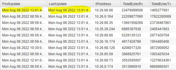 FirstUpdate, LastUpdate, IPAddress, TotalBytesRx, TotalBytesTx