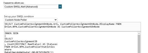 SELECT CustomPollerAssignmentOnNode.Uri, CustomPollerAssignmentOnNode.DisplayName FROM Orion.NPM.CustomPollerAssignmentOnNode AS CustomPollerAssignmentOnNodeINNER JOIN(SELECTCustomPollerAssignmentID, Count(DISTINCT RawStatus) AS StatusesFROM Orion.NPM.CustomPollerStatisticswhereDatetime>Addminute(-30,GETUTCDATE())GROUP BY CustomPollerAssignmentID) AS HistoryON CustomPollerAssignmentOnNode.CustomPollerAssignmentID=History.CustomPollerAssignmentIDWHERECustomPollerAssignmentOnNode.CustomPollername='Fortigate_HA_State_Change'AND History.Statuses>1