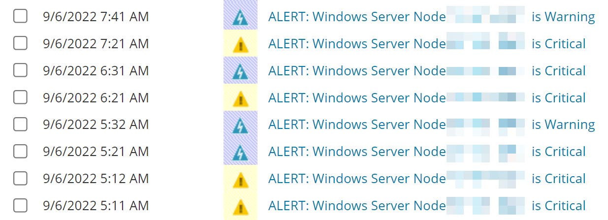 Hi there! Is there a way to make the events in the events tab more descriptive, so I can see at a glance, without hovering over the nodes, what is wrong with it? I have the alerts split up into CPU, memory and disk space, but it seems that this does not transfer to events. See below. This is all the same node, but tells me very little as to what made the node go into Warning and Critical state at the time.