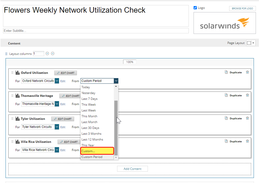 I created a report that would graph the utilization for the last 7 days for each firewall in our organization. Issue is when the scheduled report does not run or has an issue I have to manually go into each firewall content and change the custom time frame to the dates for the last week. Can the "custom Period" be defined outside of each content block and pulled in at the time of run?