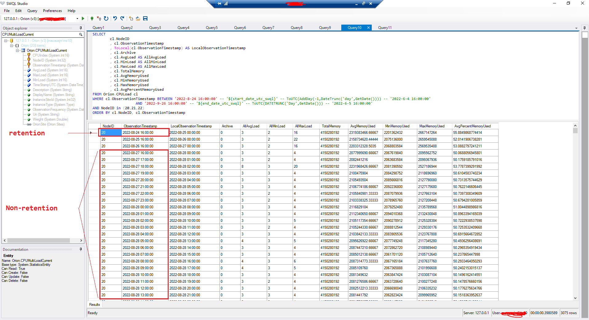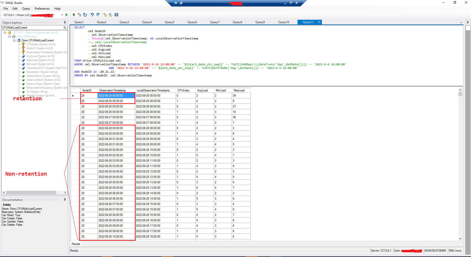 I am writing a SWQL that will join CPULoad and CPUMultiLoad tables. But old retention records of ObservationTimestamp column can not be joined because of different value.