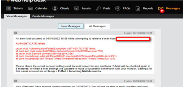 With the following message, we are experiencing AUTHENTICATION errors on the web help desk SolarWinds.