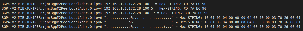 I created a UnDP poller for jnxBgpM2PeerState, jnxBgpM2PeerLocalAddr, and jnxBgpM2PeerRemoteAddr but the IP addresses are returned as a Hex String.