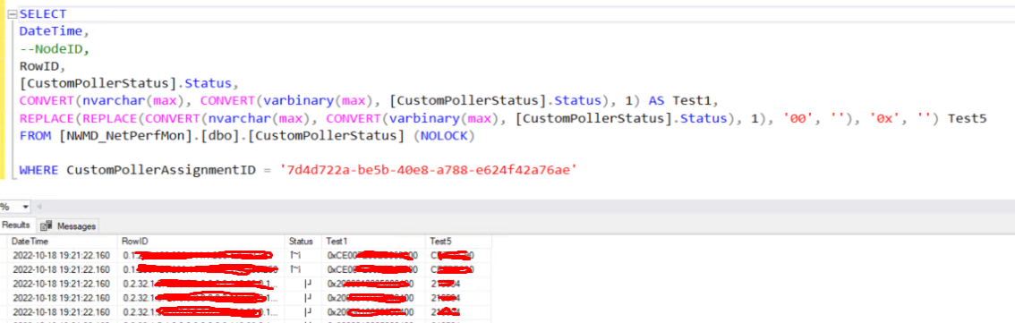 In SQL I get this character in Status though. I found a script linked below to convert it to hex which seems to work for the IPv4 address but for IPv6 it seems like half the data is missing. Is it just a limitation of what can be stored? I'm guessing from Hex I would be able to then convert to an IP format but haven't gotten that far. Would this even be possible in SQL or would I need to use Powershell to do something like this?