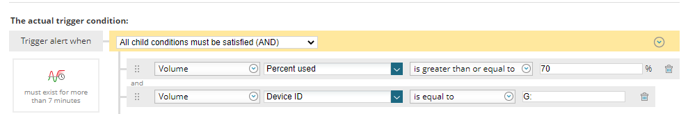 this is the trigger condition where it filters out by the disk space occupation (70%) and disk G: