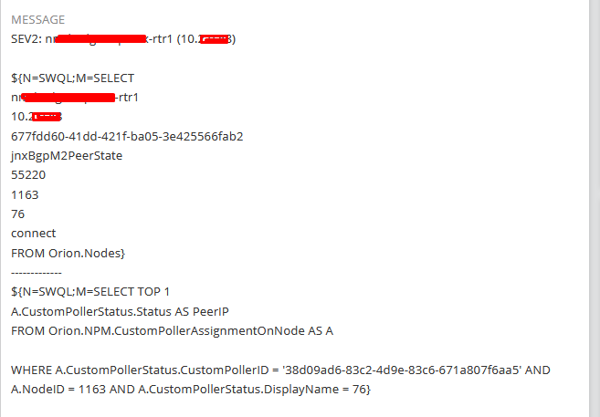 We have UDP setup to poll Juniper BGP status because the built in BGP MIB poller doesn't include IPv6 peers. I would like to have the message and NPM event to include the peer IP that went down because the object only shows an arbitray index number from the label the UDP poller was setup with.