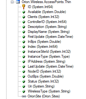 I'm confused by the Generated Properties in SWQL Studio. I need to inventory Aruba thin access points and the table 'Orion Wireless Access Points Thin' appears to have what I need (see below.) But the fields are all Generated Properties and running the SELECT TOP 1000 SWQL query produces an error.
