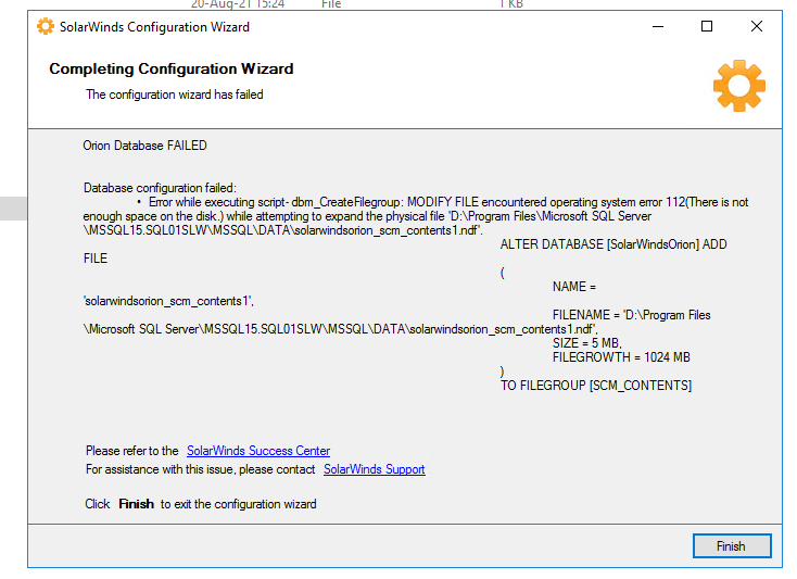 As I remember, I had the same issue - it was because of wrong default database location in SQL server setting - it was different than real location of SolarWinds database.