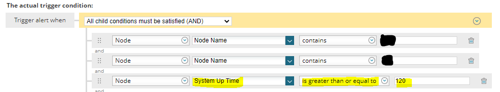 I am familiar with the alerting setup but I am thinking this has something to do with SQL queries and have tried 'WHERE Nodes.LastBoot < Getdate()-3' but then the trigger also asks for more criteria for example "Is greater than then a value" Do I fill this in too? Am i doing this right?