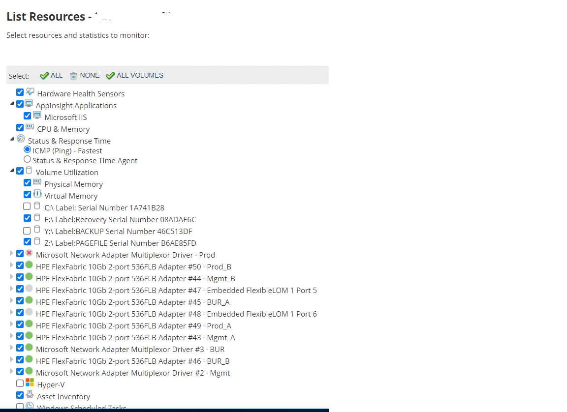 I want to know what are all the volumes or interfaces what are selected for monitoring under "List Resources" for a given nodes - is there a report that can be used to pull the selected or unselected resources for all nodes in monitoring? In this example i need to get either selected or unselected resource list