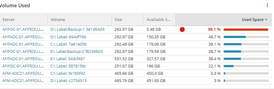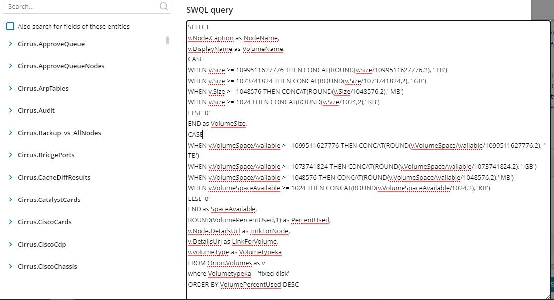 SELECTv.Node.Caption as NodeName,v.DisplayName as VolumeName,CASEWHEN v.Size >= 1099511627776 THEN CONCAT(ROUND(v.Size/1099511627776,2), ' TB')WHEN v.Size >= 1073741824 THEN CONCAT(ROUND(v.Size/1073741824,2), ' GB')WHEN v.Size >= 1048576 THEN CONCAT(ROUND(v.Size/1048576,2),' MB')WHEN v.Size >= 1024 THEN CONCAT(ROUND(v.Size/1024,2),' KB')ELSE '0'END as VolumeSize,CASEWHEN v.VolumeSpaceAvailable >= 1099511627776 THEN CONCAT(ROUND(v.VolumeSpaceAvailable/1099511627776,2), ' TB')WHEN v.VolumeSpaceAvailable >= 1073741824 THEN CONCAT(ROUND(v.VolumeSpaceAvailable/1073741824,2), ' GB')WHEN v.VolumeSpaceAvailable >= 1048576 THEN CONCAT(ROUND(v.VolumeSpaceAvailable/1048576,2),' MB')WHEN v.VolumeSpaceAvailable >= 1024 THEN CONCAT(ROUND(v.VolumeSpaceAvailable/1024,2),' KB')ELSE '0'END as SpaceAvailable,ROUND(VolumePercentUsed,1) as PercentUsed,v.Node.DetailsUrl as LinkForNode,v.DetailsUrl as LinkForVolume,v.volumeType as VolumetypekaFROM Orion.Volumes as vwhere Volumetypeka = 'fixed disk'ORDER BY VolumePercentUsed DESC