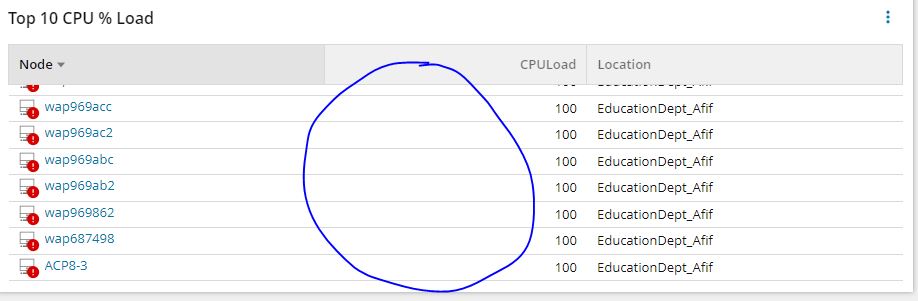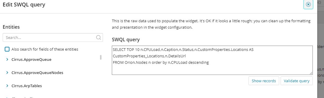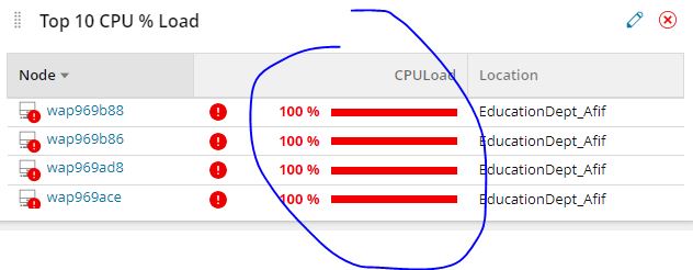 SELECT TOP 10 n.CPULoad,n.Caption,n.Status,n.CustomProperties.Locations AS CustomProperties_Locations,n.DetailsUrl FROM Orion.Nodes n order by n.CPULoad descending