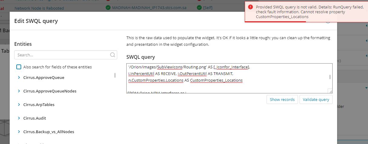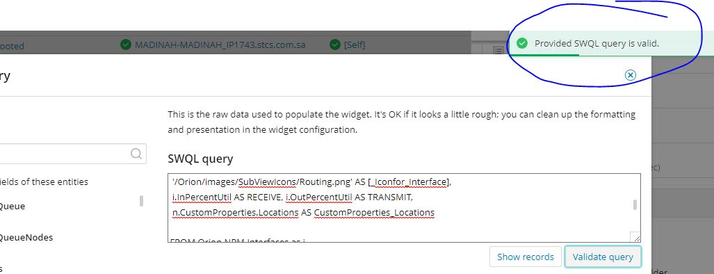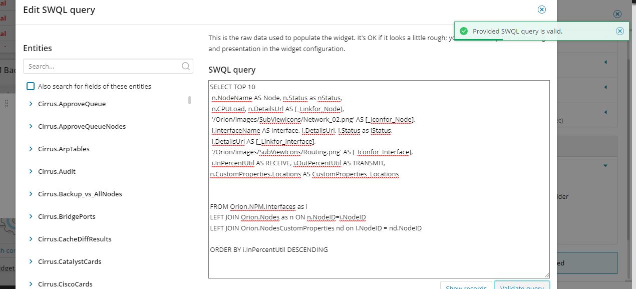 SELECT TOP 10 n.NodeName AS Node, n.Status as nStatus, n.CPULoad, n.DetailsUrl AS [_Linkfor_Node], '/Orion/images/SubViewIcons/Network_02.png' AS [_Iconfor_Node], i.InterfaceName AS Interface, i.DetailsUrl, i.Status as iStatus, i.DetailsUrl AS [_Linkfor_Interface], '/Orion/images/SubViewIcons/Routing.png' AS [_Iconfor_Interface], i.InPercentUtil AS RECEIVE, i.OutPercentUtil AS TRANSMIT FROM Orion.NPM.Interfaces as i LEFT JOIN Orion.Nodes as n ON n.NodeID=i.NodeID ORDER BY i.InPercentUtil DESCENDING