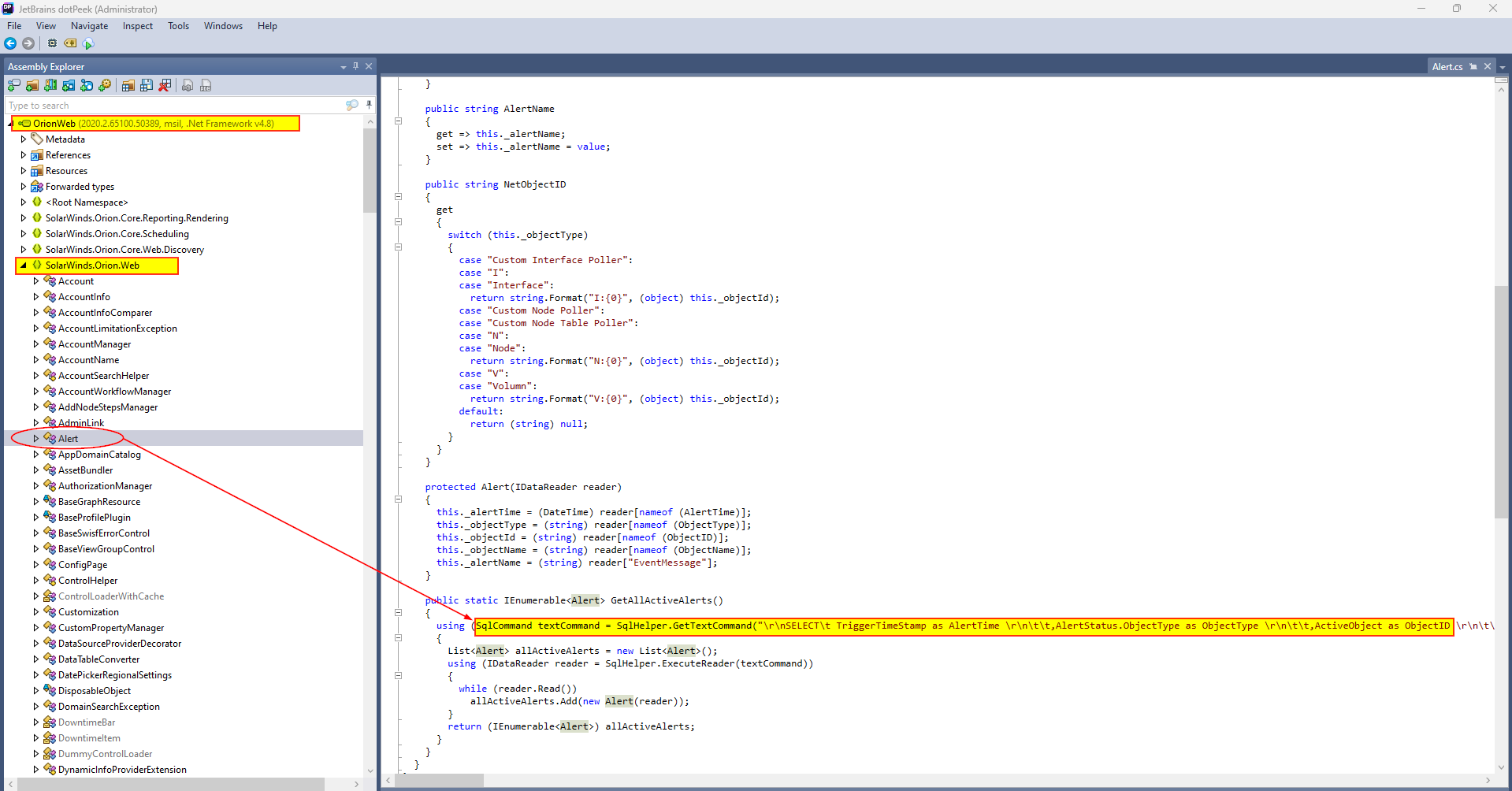 I didn't immediately find anything useful, but I kept snooping around and eventually found my first SQL query. So, whatever it is I'm looking at is going to run that SQL query in order to build out whatever data it needs. Okay, the file is named OrionWeb.dll, opening the file shows us SolarWinds.Orion.Web, and opening that shows us a bunch of stuff. More specifically, that shows us something called Alert, which contains a SQL query. I think it means that SQL query is used for something related to Alerts, which is somehow tied to web stuff? and Orion? You can copy and paste that query into a notepad and run it through a cleaner to get it all prettied up, then you can run it in a report/widget to see what kind of data it pulls back.