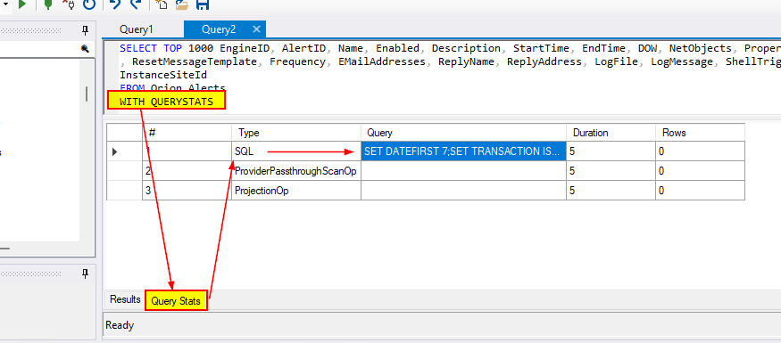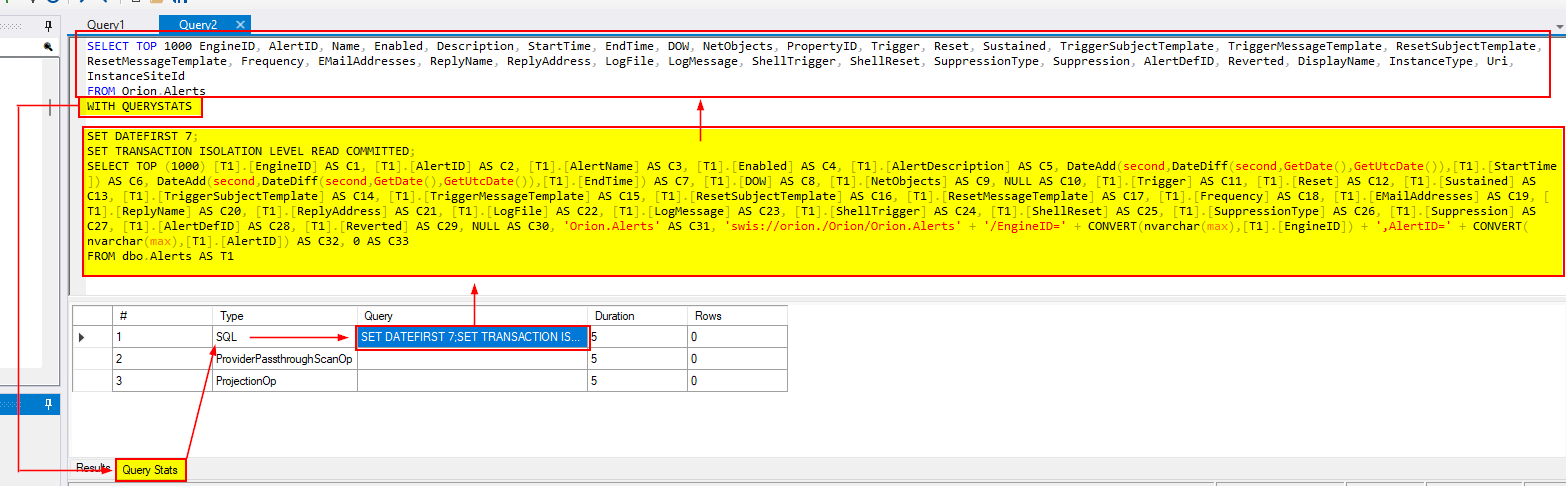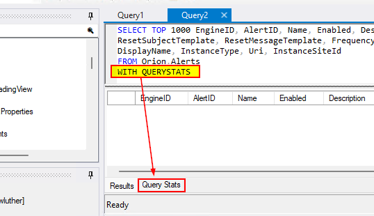 Adding the WITH QUERYSTATS to your SWQL query will create a little tab at the bottom of the OrionSDK.