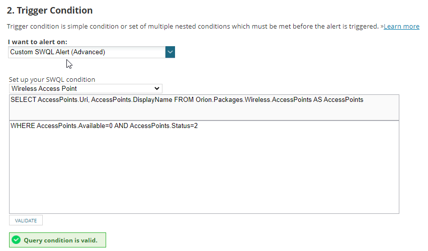 I'm hoping someone can point me in the correct direction as I cant figure out how to reference additional fields when creating a Custom SWQL Trigger condition. I'm looking to report on our Meraki WAPS and have a Custom SWQL Trigger condition which validates and is working as intended. I want to include information in the email that goes out like DisplayName and IP Address.