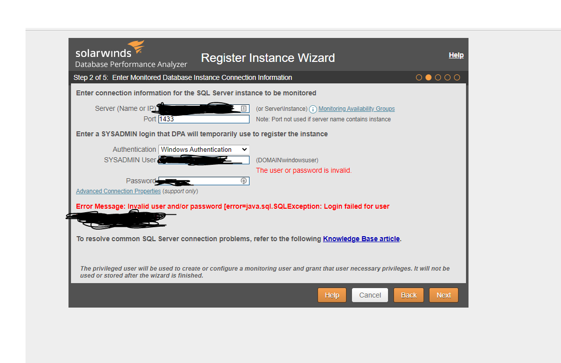 I am trying to register an instance for dpa but when I enter the sysadmin creds, the same ones I normally use for other SolarWinds activities, and I get the following message below