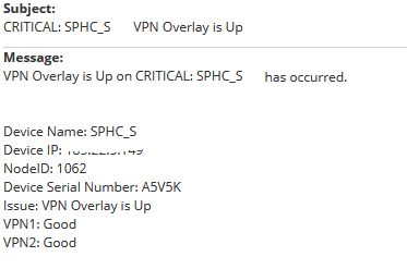 Within the Alert body, I have added some SWQL statements (one for each VPN status, and one for the Serial Number of the device) however, when simulating the alert I seem to get data for another node (i.e. a different device Serial Number and VPN status), probably the first listing in the table results.