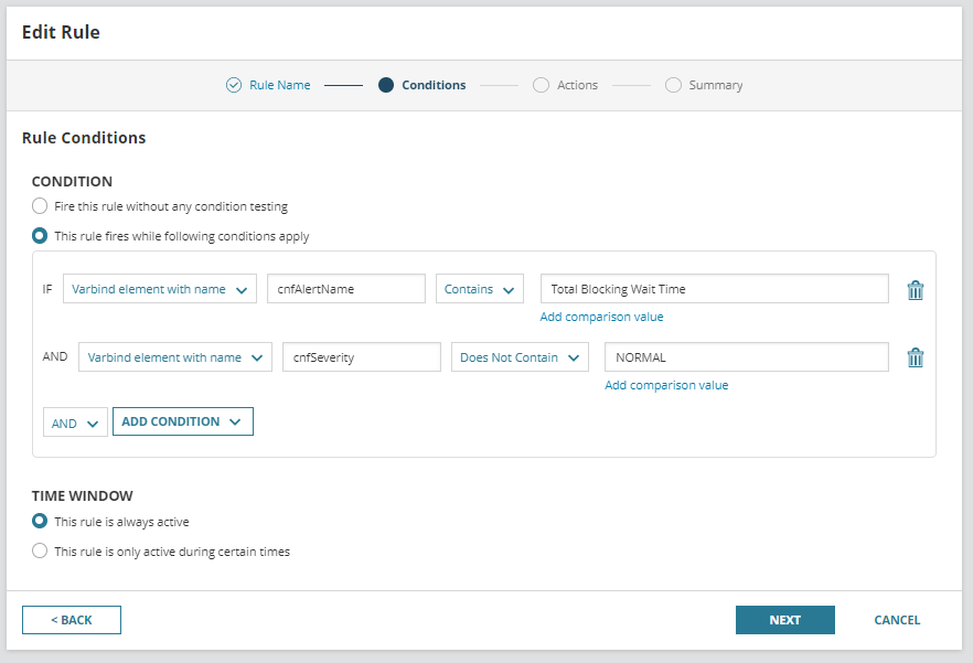 I then repeated these steps for a rule called "DPA Reset Trigger - Total Blocking Wait Time", with almost the same logic, except with the severity set to normal.