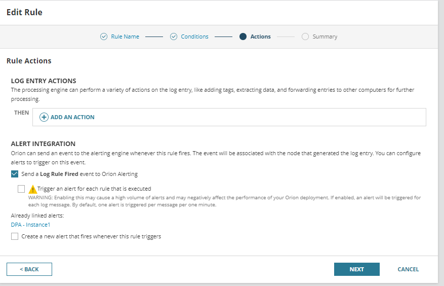 And then under actions ensure the option for alert integration includes the option to "Send a Log Rule Fired event to Orion Alerting" is set.