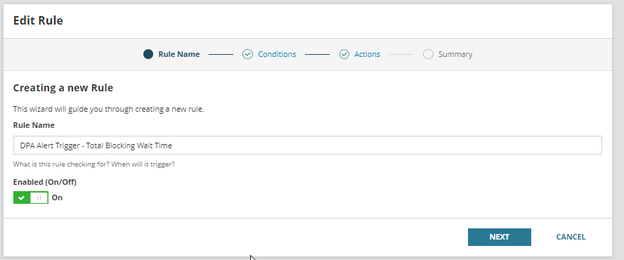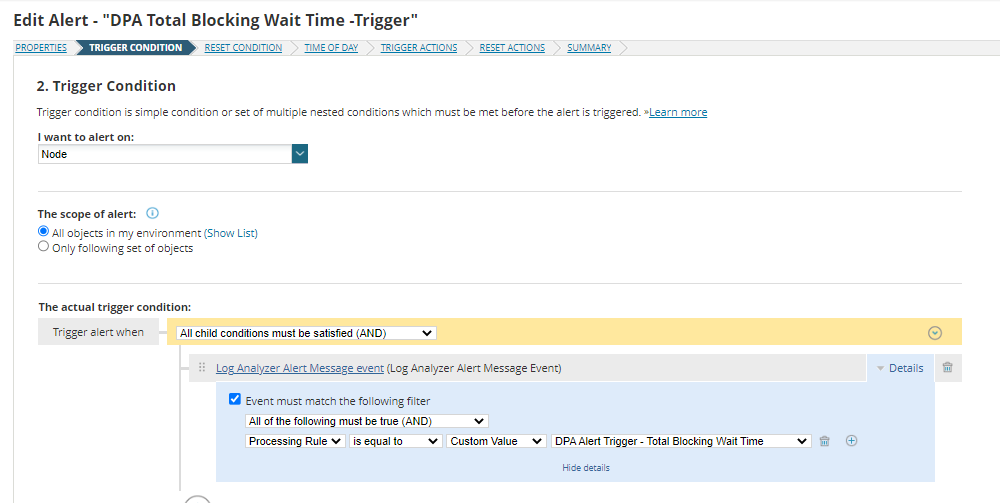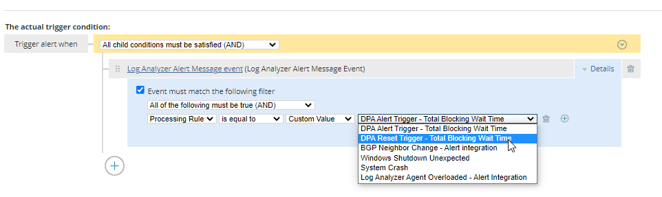 So the next thing to do is create 2 rules to handle both the trigger and reset logs. You can follow the steps here to create the rules . I like to include the keywords "trigger" or "reset" in the rule name, as it's useful later. In my example I went with "DPA Alert Trigger - Total Blocking Wait Time"