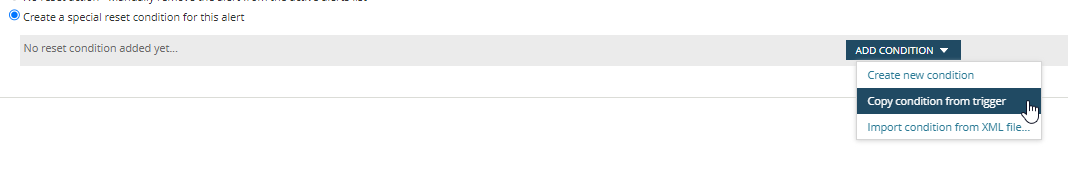 In this case I'm going to select "Create a special reset condition for this alert" and copy the condition from the trigger
