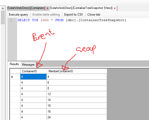 I can see from browsing the SW database that there is a solarwinds.containertreesnapshot that seems to show a relationship between a group and its parent group -